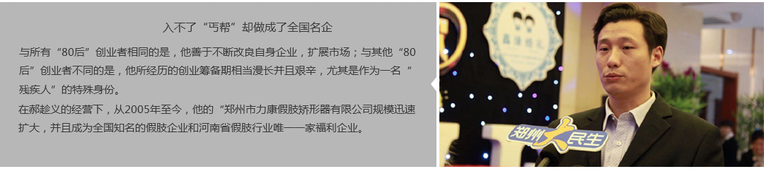 鄭州市力康假肢矯形器有限公司(簡稱力康),是一家專業(yè)從事假肢矯形器的設計、研發(fā)、制作及裝 配的專業(yè)機構。成立于1992年是河南省唯一一家福利企業(yè)。力康下設業(yè)務部、技術部、住院部、康復 部、售后服務部,并配有現代化的裝配車間和功能齊全的訓練大廳,為殘疾朋友康復訓練提供了可靠 保障。總經理穿戴假肢多年,有著豐富的臨床經驗和親身體會;多年來,力康已為全國幾十萬名殘疾 朋友安裝上舒適、美觀、耐用的假肢和矯形器具,使他們更大限度地恢復了正常的工作和生活。“產 品即人品”的質量理念、先進的技術、實惠的價格、完善的售后服務是力康取勝的法寶……